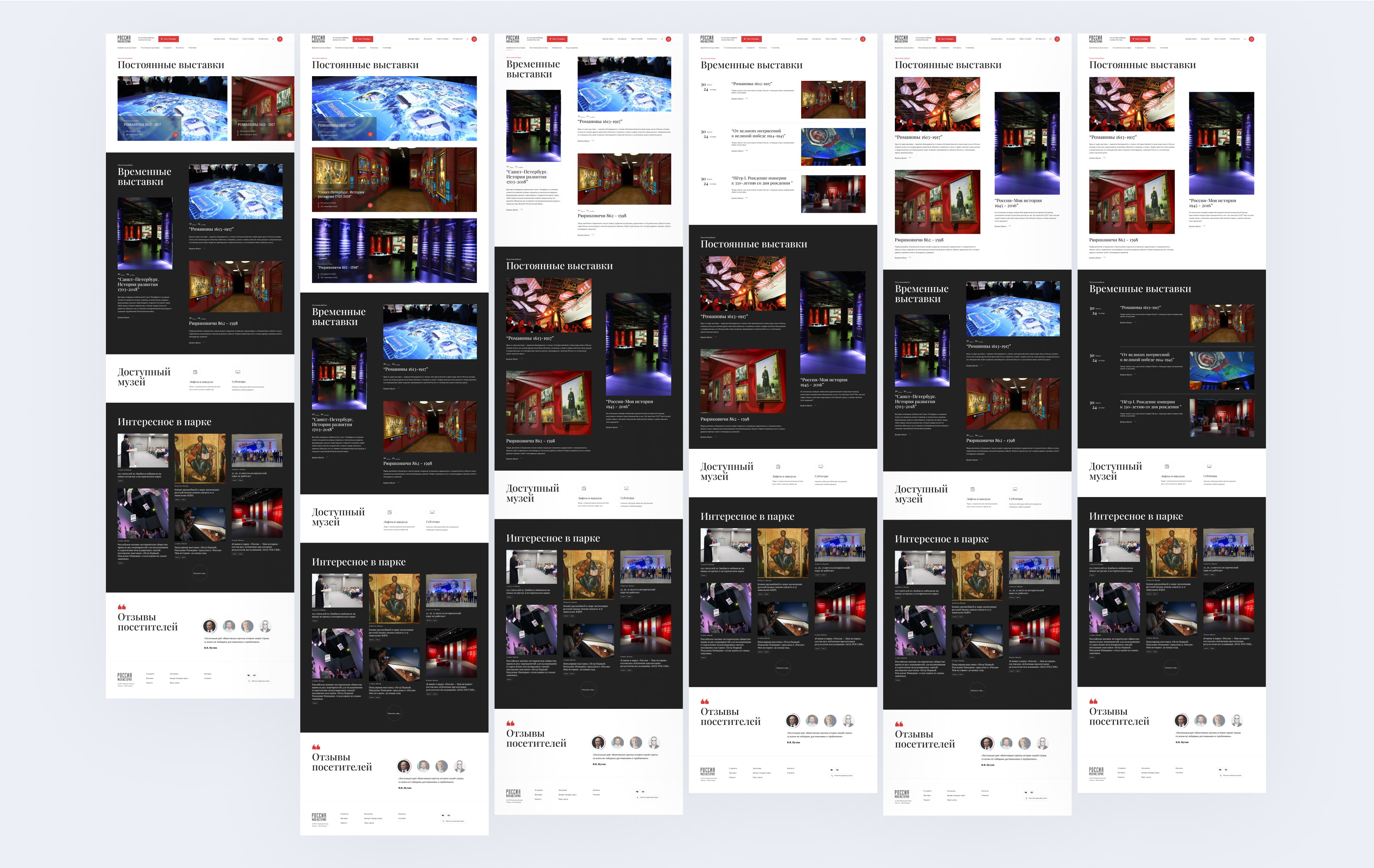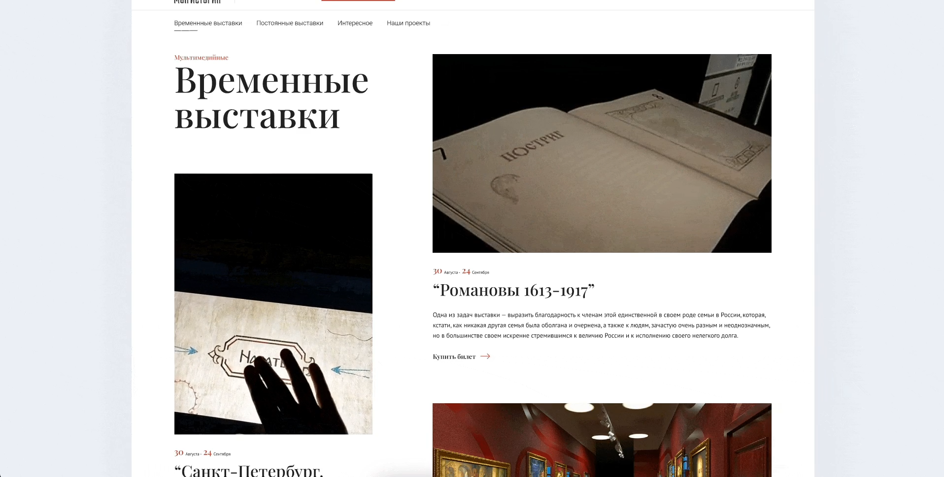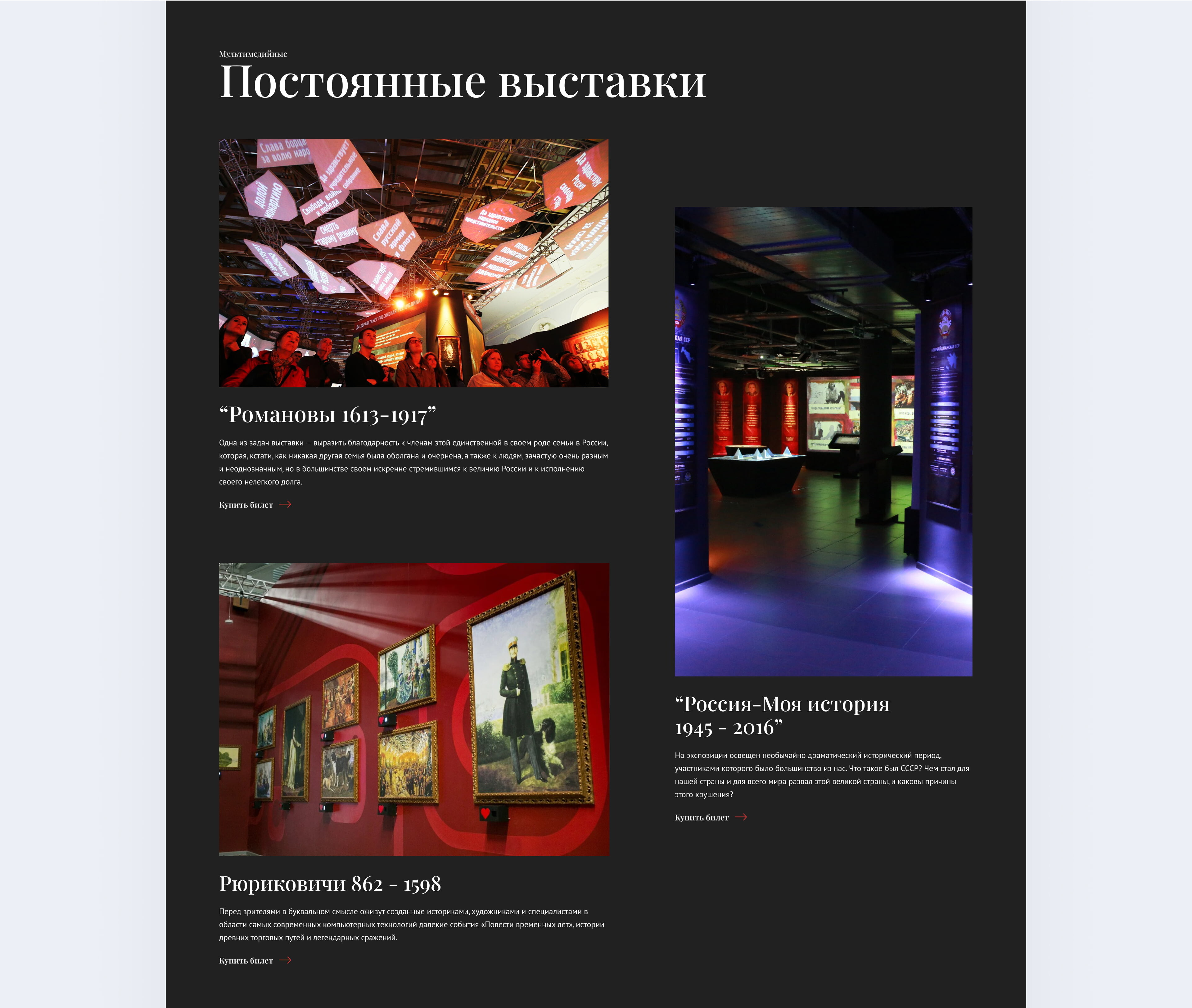 Остановились на таком варианте. Временные выставки вынесли на первый план. Нестандартная верстка карточек, за счет размера и положения позволит увеличить продажи билетов к продвигаемой выставке — на самую левую карточку наибольший акцент. В это место можно ставить выставки, которые скоро закончатся и им нужно больше внимания.
