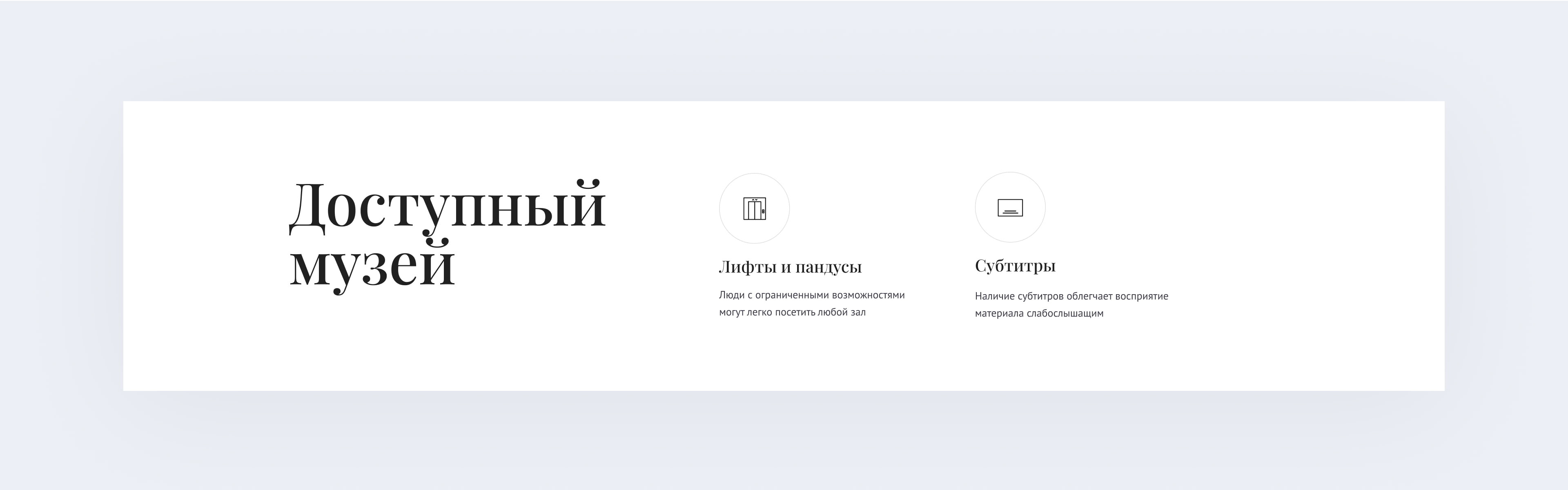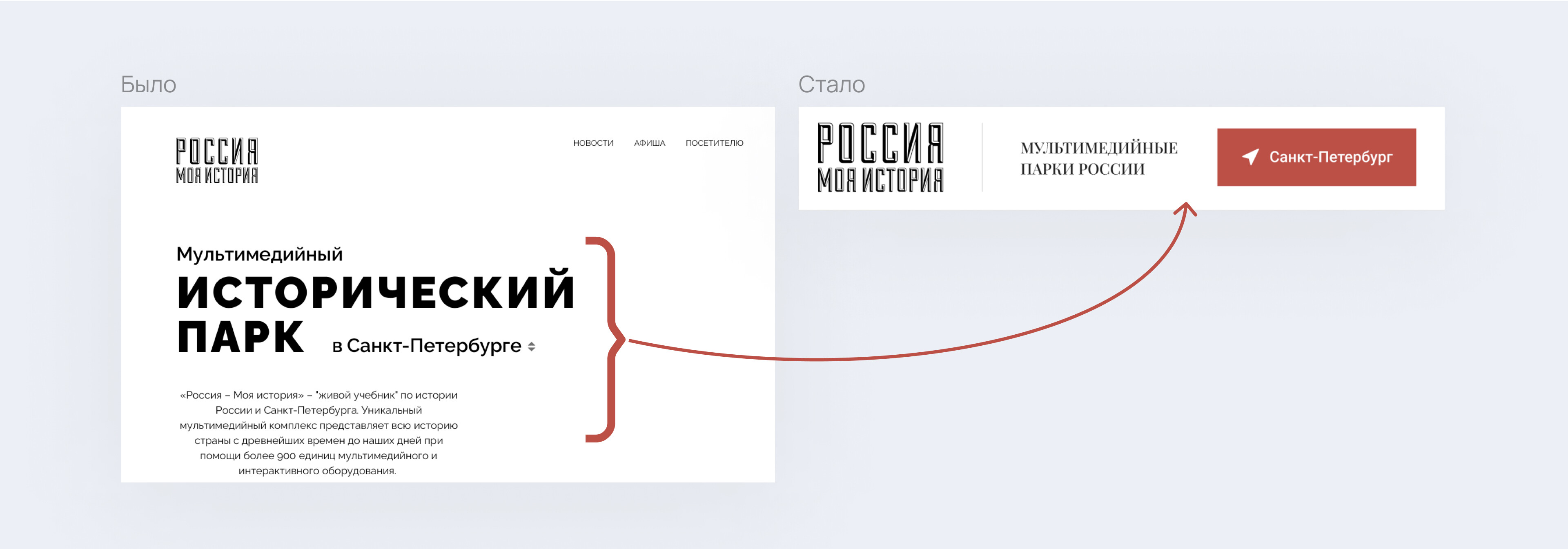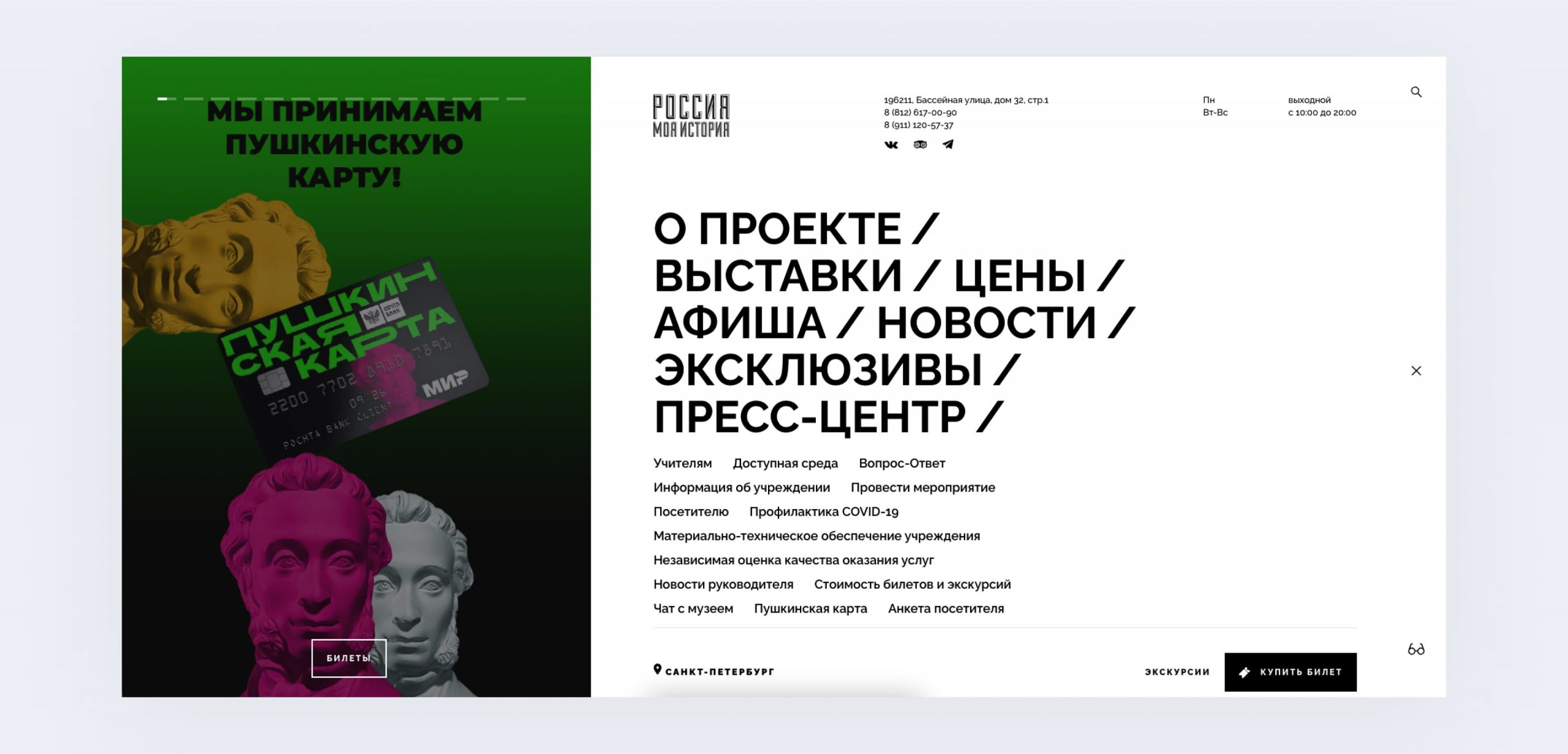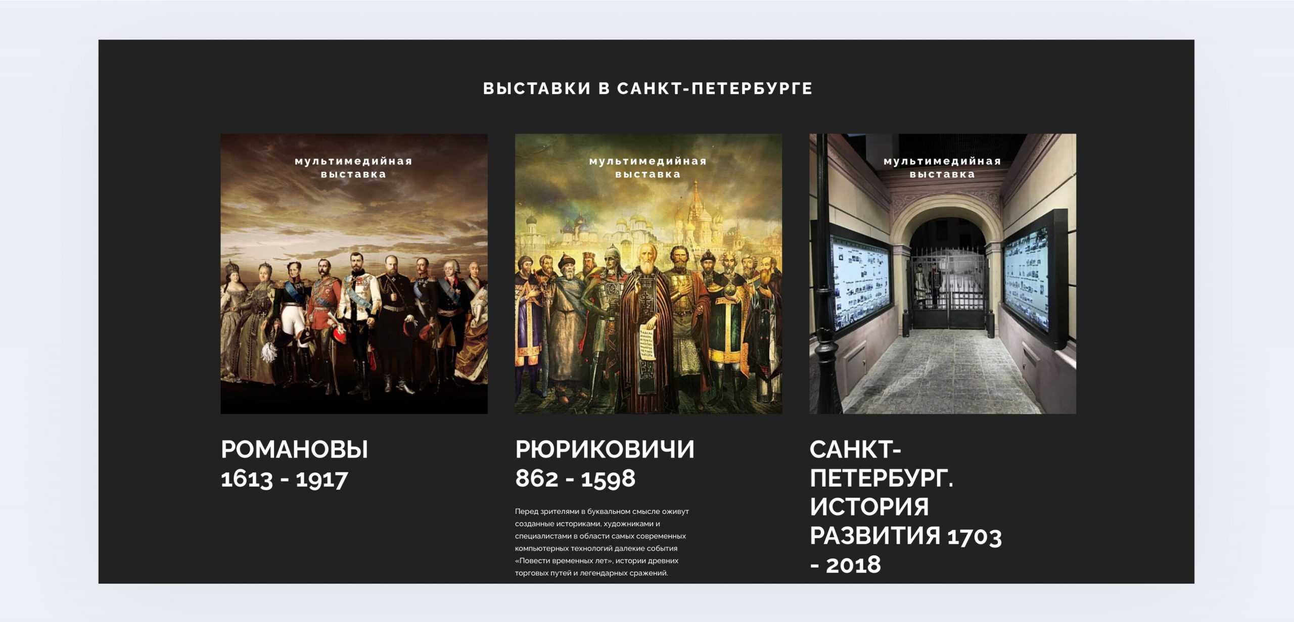 Максимально сократили информацию и, не потеряв суть, разместили в хэдере. Это освободило место для более важных акцентов — теперь можно показать выставки.
