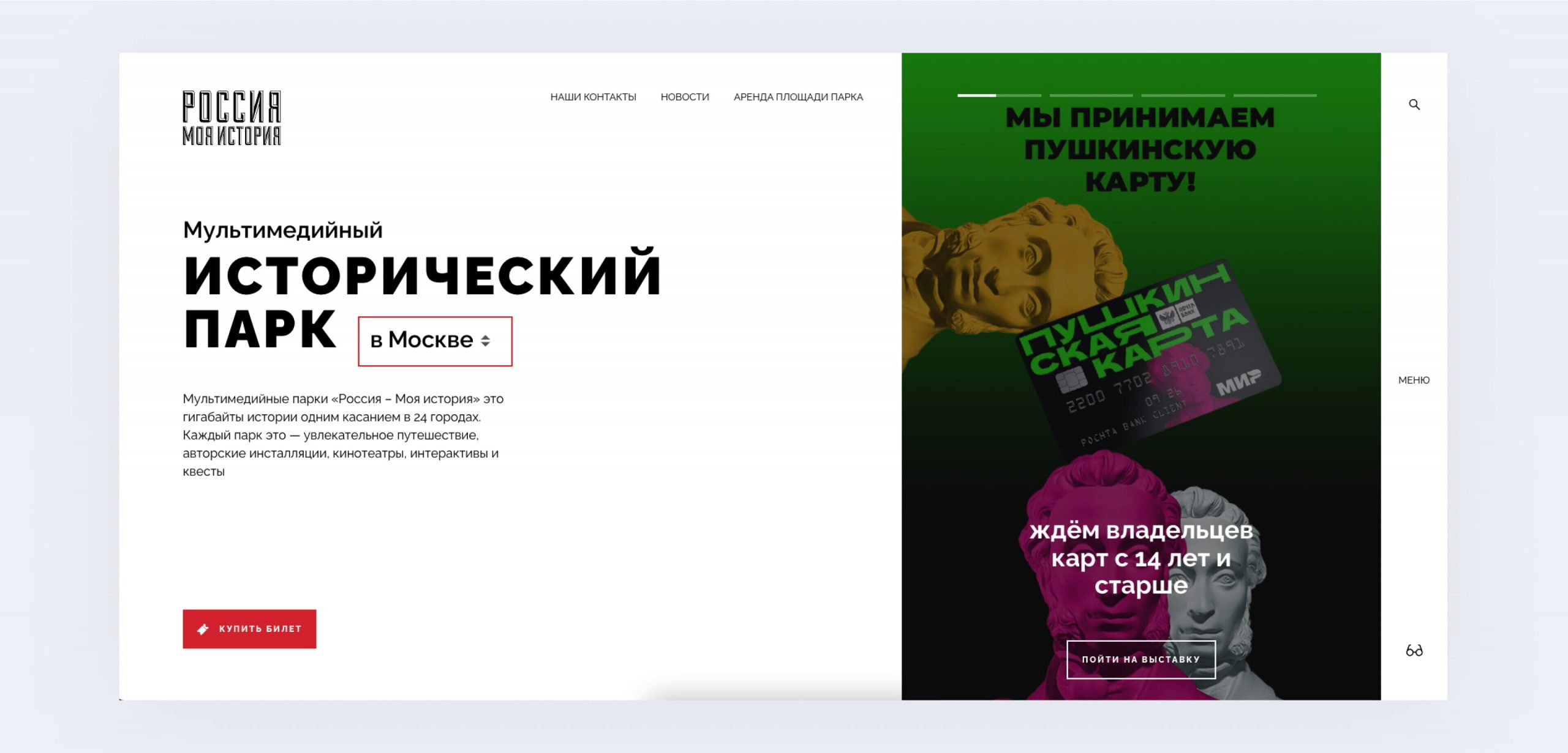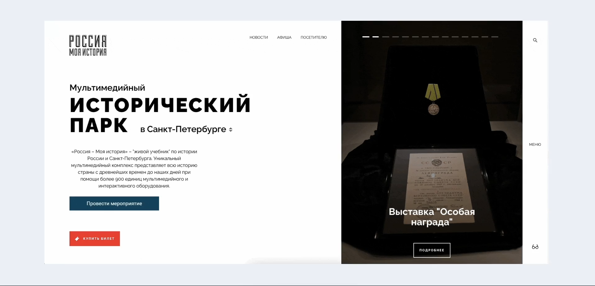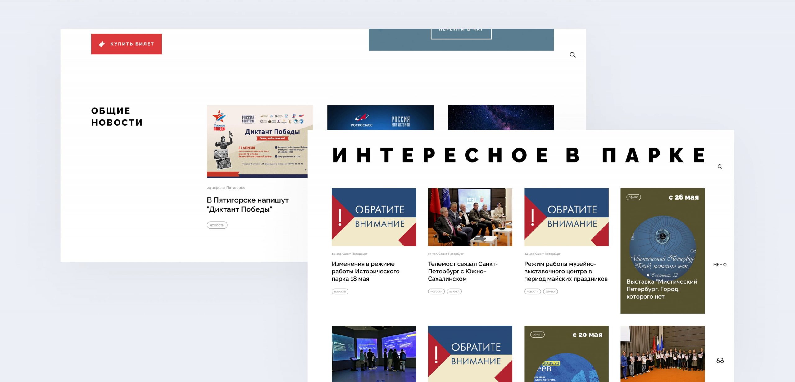 Использовали живые фото, чтобы погрузить пользователя в атмосферу парка. Это нужно, чтобы отстроиться от обычных музеев — в прошлом варианте сайта было неочевидно, что это мультимедийный парк.
