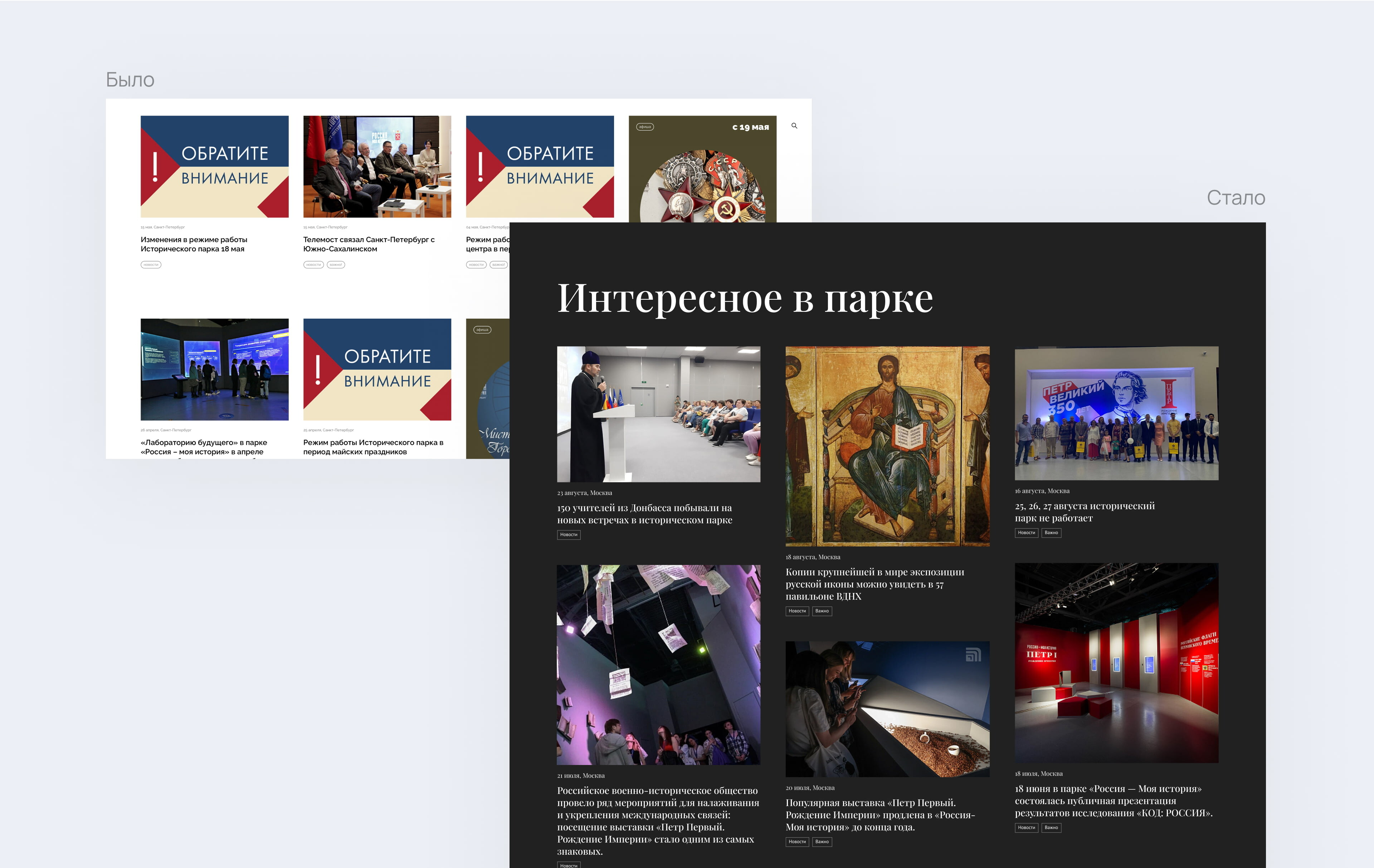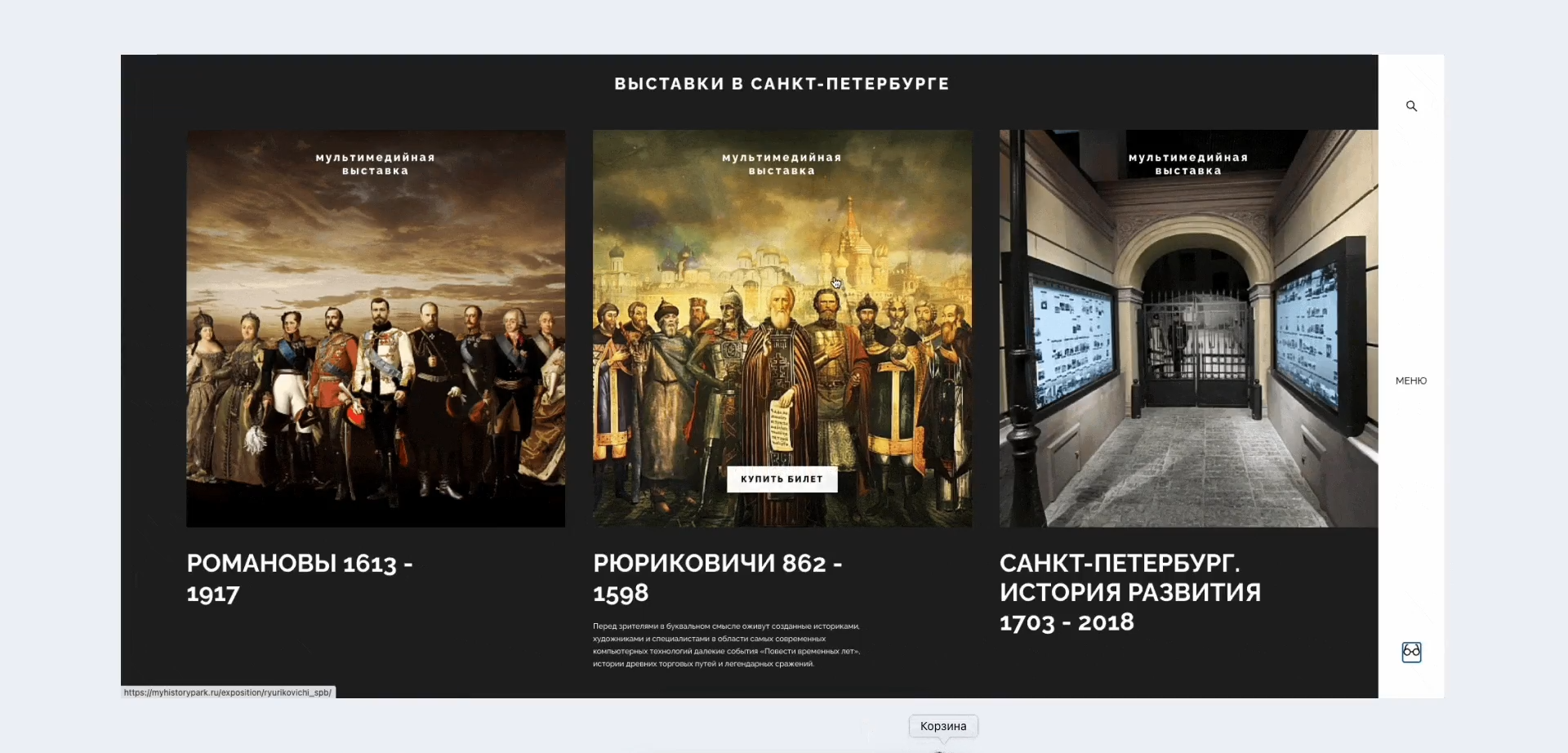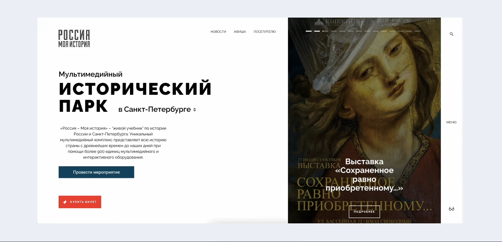 Использовали живые фото, чтобы погрузить пользователя в атмосферу парка. Это нужно, чтобы отстроиться от обычных музеев — в прошлом варианте сайта было неочевидно, что это мультимедийный парк.