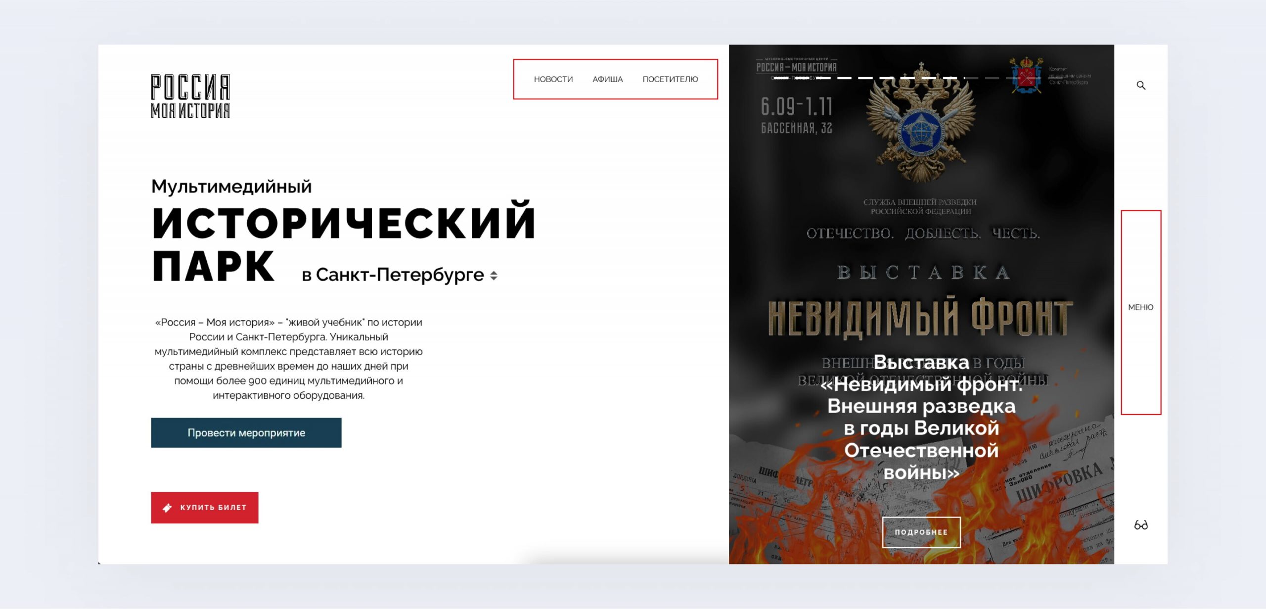 1. Запутанная навигация: меню вверху — меню справа. В верхнем меню вынесены второстепенные страницы, а важные страницы такие как выставки, цены, афиша спрятаны в боковом меню, которое не сразу заметно.