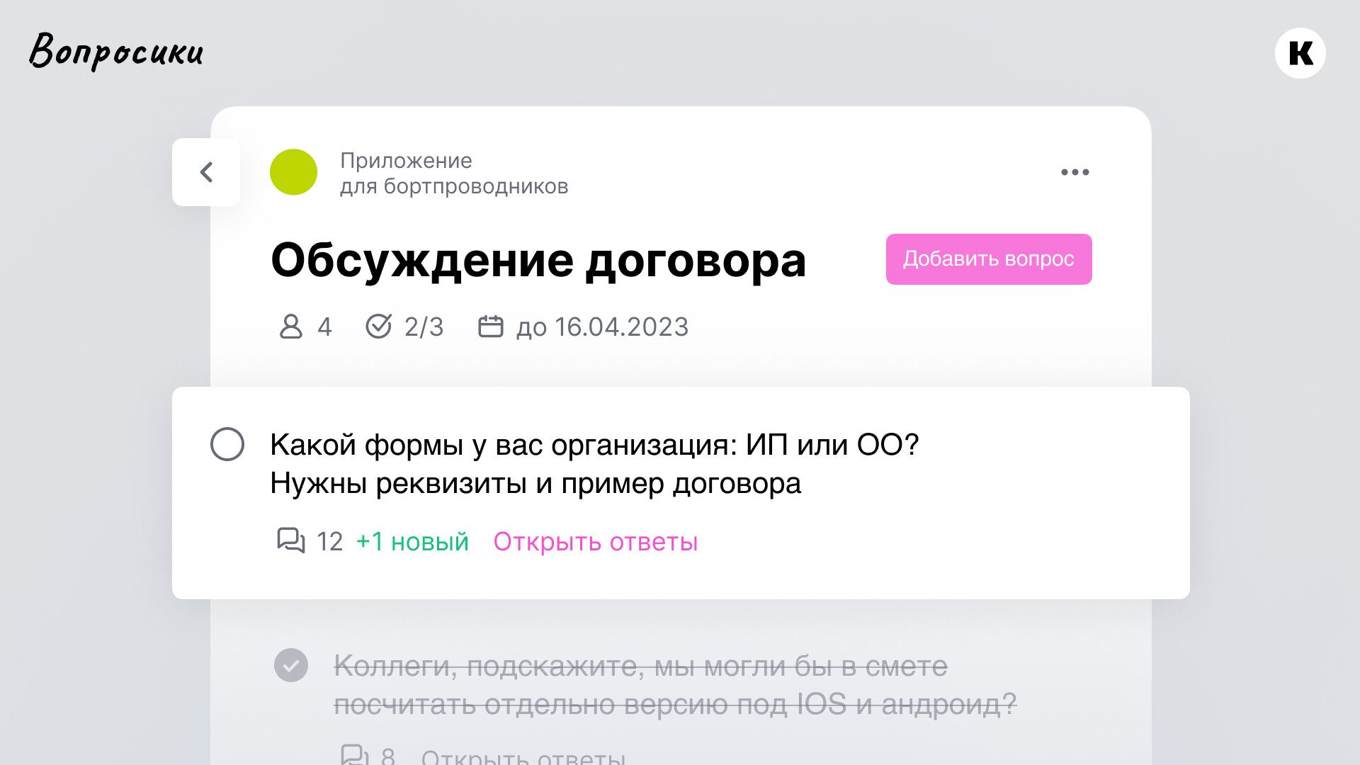 Привет, на связи KOTELOV. Делимся идеей нашего нового сервиса. Он поможет не запутаться в куче вопросов в почте и не пропустить важные. А с помощью удобного треда «обкашлять вопросики онлайн станет проще».