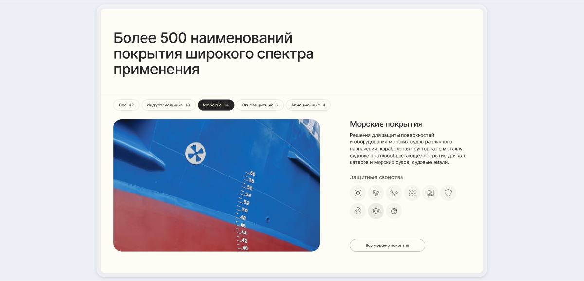 Мы структурировали продукцию, выделив четыре основные категории покрытий. После общего описания компании мы логично переходим к презентации продукции. Это помогает выстроить последовательность: сначала пользователь знакомится с брендом, затем узнает о видах покрытий и их свойствах.